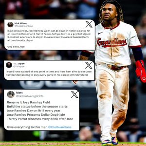The image said everything before a single quote needed to be added. JosĂ© RamĂrez, dirt staining the front of his home white uniform, walking with the quiet intensity Cleveland has…