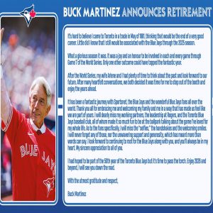 TORONTO — An era quietly, then suddenly, came to an end on Friday as Buck Martinez, the unmistakable voice and enduring face of the Toronto Blue Jays, officially announced his…